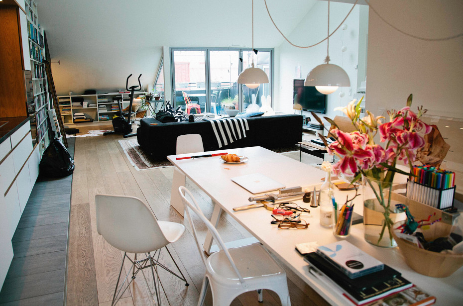 Tomas Skoging的家,挑高的公寓引入光線是他最喜愛之處,與兩個年幼的孩子同住,玩具與畫作讓家更表情。小陽台與整面的書牆,有點酷且品味出眾的家!來自好站